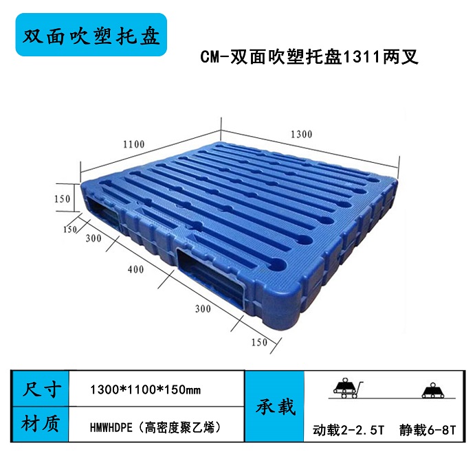 中空吹塑塑料托盤的生產(chǎn)與一般的中空制品吹塑成型方法相類似,因其產(chǎn)品較大,且為雙面型,需要較大的擠出機、合模機及模具等。目前國內(nèi)中空成型機制造廠家已經(jīng)研發(fā)出專業(yè)高速生產(chǎn)高強度吹塑托盤的超大型中空成型機,采用HDPE(低壓高密度聚乙烯)高強度塑料生產(chǎn),成型速度較快,產(chǎn)品質(zhì)量較好,具有高強度、壽命長的特點,一般吹塑托盤的使用壽命可以達到5~10年,同時可以在-40~70℃的環(huán)境下穩(wěn)定工作。其產(chǎn)品的動載可以達到3t以上,抗彎強度均是較高的水平。是高強度使用環(huán)境的首選托盤,目前其價格比注塑托盤偏高一些,但其使用壽命特別長,所以它的性價比是所有托盤中最高的。吹塑托盤隨著成型設備價格的大幅度降低,將會在近年內(nèi)獲得較快的發(fā)展。將對于節(jié)約有限的石油資源與物流成本有極大的好處。